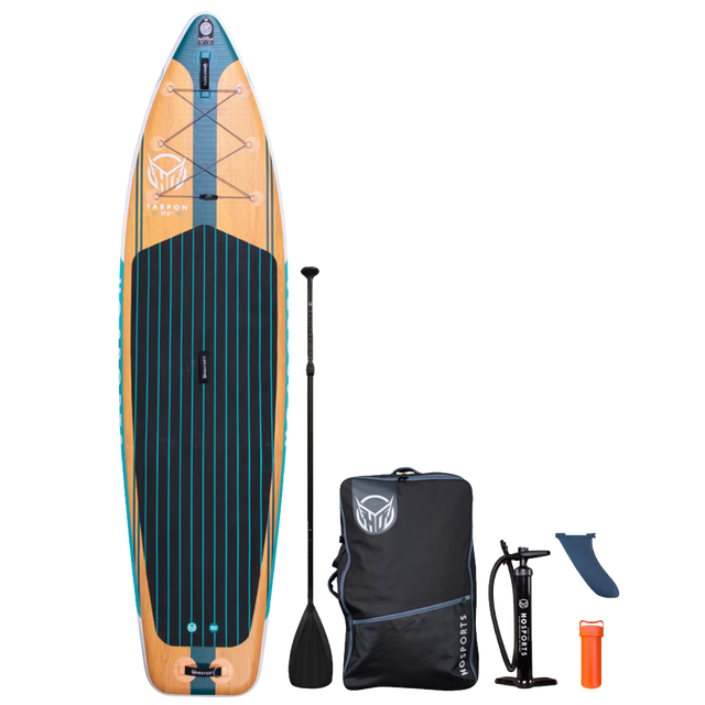 The Tarpon inflatable stand-up paddleboard by HO Sports combines comfort and functionality in a highly portable, easy-to-store package. It’s upgraded touring shape is more hydrodynamically efficient for increased speed with the same great stability from it’s wide-glide profile. It’s innovative 15cm(6in) Nano Stitch Lite, double sidewall construction provides maximum rigidity to weight ratio(25% lighter than the original!) for even easier transport and tighter storage. The Tarpon’s Dual-Layer marine grade deck pad will have your feet feeling like they’re standing on a cloud while delivering great traction. Upgraded with a large hydrodynamic Touring Fin, the Tarpon tracks better than ever for excellent speed, efficiency and maneuverability. he lever-lock fin system means no tools required. This paddleboard now features multiple dual layer neoprene padded carry-handles so you can lift from the center, front or rear. We’ve even added a D-ring in the rear for your surf leash! The Tarpon includes a backpack for easy transport/storage, a high-pressure pump with PSI gauge to ensure you reach the proper PSI and the Strike adjustable 3-piece paddle with rider height indicator that works great while standing, kneeling or sitting. Get yours today and explore the great outdoors! Quick Features: • Dropstitch Construction • More efficient touring shape • Wide Glide Profile • 15cm(6in) Nano Stitch Lite / double sidewall • Dual layer Marine EVA Deck Pad • Touring Fin with Lever-lock • Double X front bungee storage zone • Dual Action Hand Pump with PSI pressure gauge • Strike Adjustable 3 Piece Paddle • Storage & Carry Backpack • Multiple Dual Layer Neoprene Padded Carry Handles • 2.5mm stainless D-rings