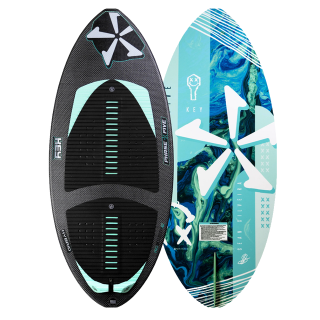 The 2025 Phase 5 Key Wakesurf Skim Board was originally designed by Sean Silveira to cater to his super technical riding. Coming from the Matrix, Sean decided to chop the nose and tail into a squared nub shape which makes it an inch shorter than the Matrix on each offered size. The Phase Five Key Wakesurfer delivers all the elements next generation wakesurfers are after. The Key rotates quickly and carries tons of speed through trick combinations thanks to its thin poppy core and subtle V-Spline bottom contours. The 2025 Phase 5 Key Wakesurf Skim Board is constructed with Hybrid Carbon™ material to take a beating. It is built with a single fin setup and loaded with our 1” Skim Fin. It is the KEY for advanced riding!