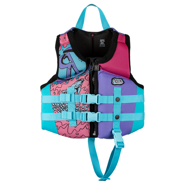 The 2026 Ronix Child August CGA Life Jacket is a lightweight water resistant girl's vest approved by the Coast Guard in the United States and Canada. Using materials and designs that will keep your child comfortable for an all-day boating adventure. Available in 3 vest sizes for the up and coming. This model has a weight range of 33 to 55 lbs.