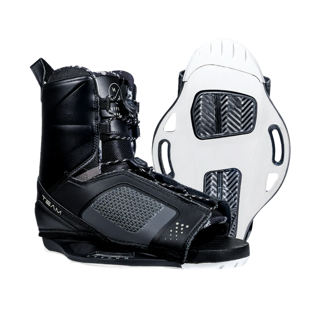 The 2026 Hyperlite Team OT Wakeboard Bindings was built for a rider looking for the feel and functionality of a very supportive binding with adjustability and the ability to share. The slightly higher cuff and seamless liner construction allows for additional support with a comfortable fit. The adjustable open toe design makes it a great choice to accommodate a wide array of foot sizes. Dual quick cinch lace zones allow for easy entry and exit at the beginning or end of your set. The Team OT Binding also utilizes the new Low Pro Plate System for a lighter weight feel and the closest foot to board connection possible.