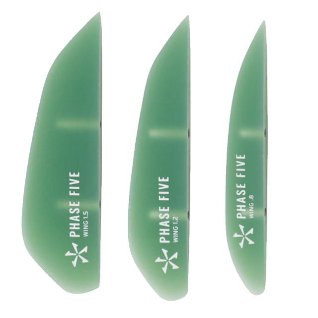 The Phase 5 Wing Fin is shorter in length and features pronounced angles. The Wing .8 has the least amount of traction out of any P5 skim fin, the 1.2 is looser than the stock 1 tail fin and the 1.5 has a super aggressive and snappy feel. *Includes ribs and 1.25" screws