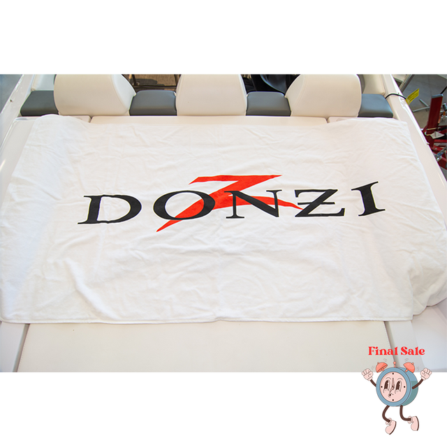 The Donzi Boats Towel is perfect to keep onboard to cover engine hatches and keep yourself dry! This ultra soft 20lb towel is 35 inches by 70 inches and has a 17 inch by 35 inch print. Show your favorite boat brand some love with this Donzi Boats Towel.